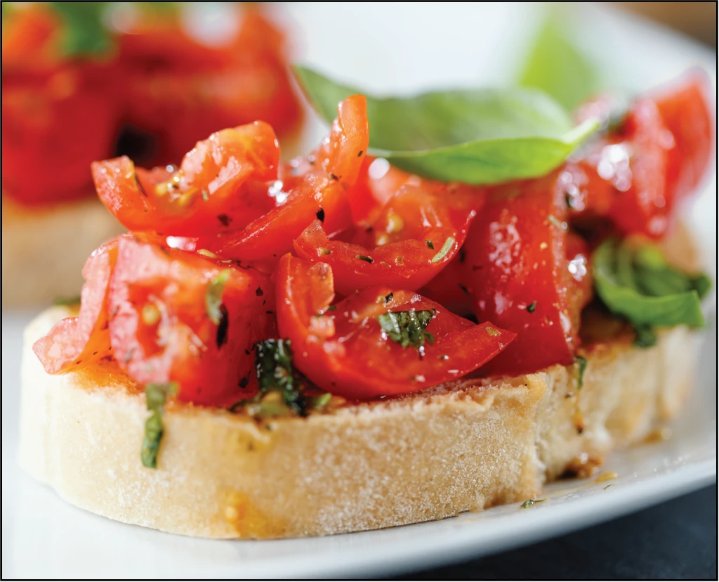 Tomat, grillat focacciabröd, basilika, balsamico reduktion.