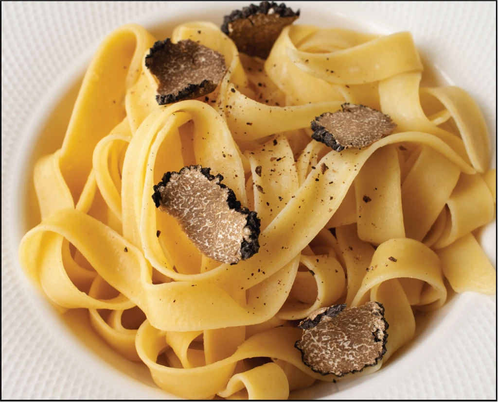 Färsk tagliatelle, smör, olivolja (extra virgin), vitlöksklyfta, skalad svart tryffel, havssalt och nymalen peppar.