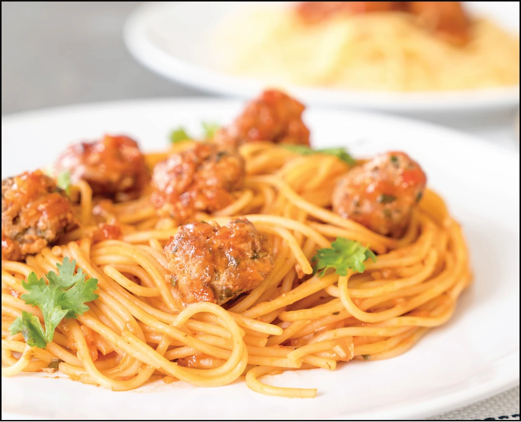 Spaghetti tillagad i tomatsås med nötkött polpette toppas basilica.