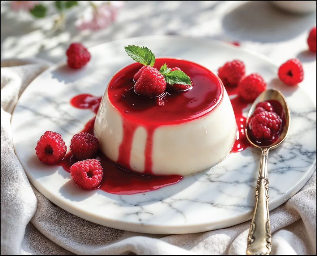 Grädde, socker, vanila och gelatin. Serve med bloody hallon sås.